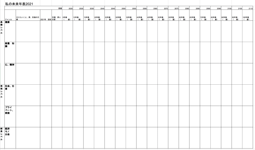 年表は2025年から5年きざみにしました。ここに目標の達成時期と、5年ごとに「それまでに何をしていなければならないか」を書き込みます。